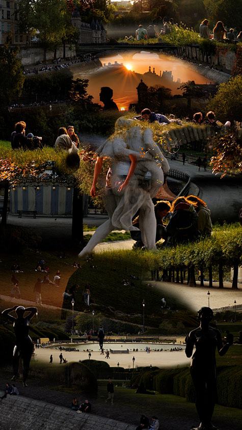 Im Zentrum der Installation steht die Videocollage Paris Nights, inspiriert von der dynamischen Komposition und dem dramatischen Hell-Dunkel der barocken Malerei – hier umgesetzt mit zeitgenössischen, lichtdurchfluteten Momenten.
